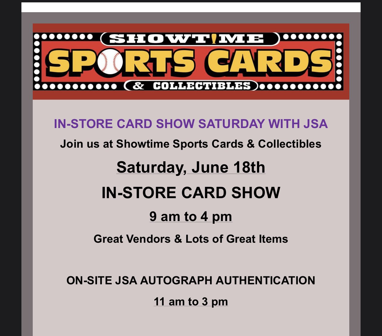 Store Hours Monday 11am-6pm Tuesday 11am-6pm Wednesday 11am-6pm Thursday 11am-6pm Friday 11am-10pm Saturday 11am-6pm. Showtime Sports Cards Collectibles. PPP Loan Information Loan 1147977405.